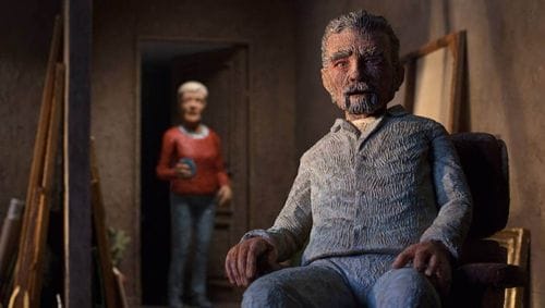 Daria Kashcheeva’s film is rendered with what appears to be classic stop-action animation. The man and his daughter have been very roughly rendered — it’s almost as if their heads were carved from blocks of wood — and they move through a detailed environment.